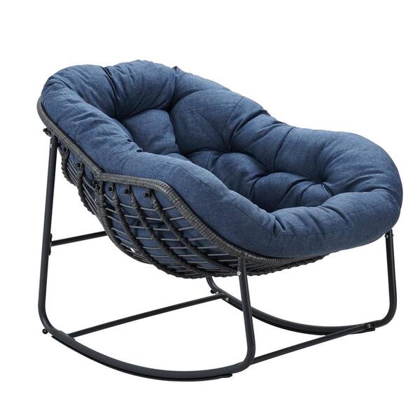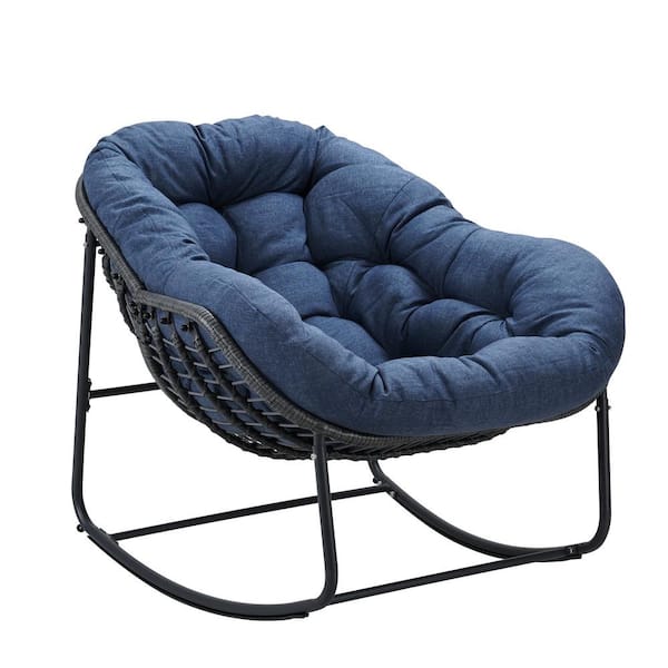 Black Metal Outdoor Rocking Chair with Navy Blue Cushions