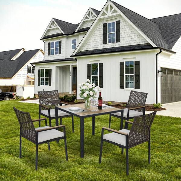 Dark Brown All Weather 5-Piece Wicker Outdoor Dining Table Sets with Umbrella Hole, Gray Cushions