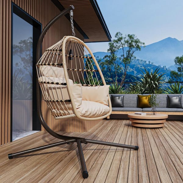 Foldable 1-Person Black Metal Patio Swing with Stand and Beige Cushion