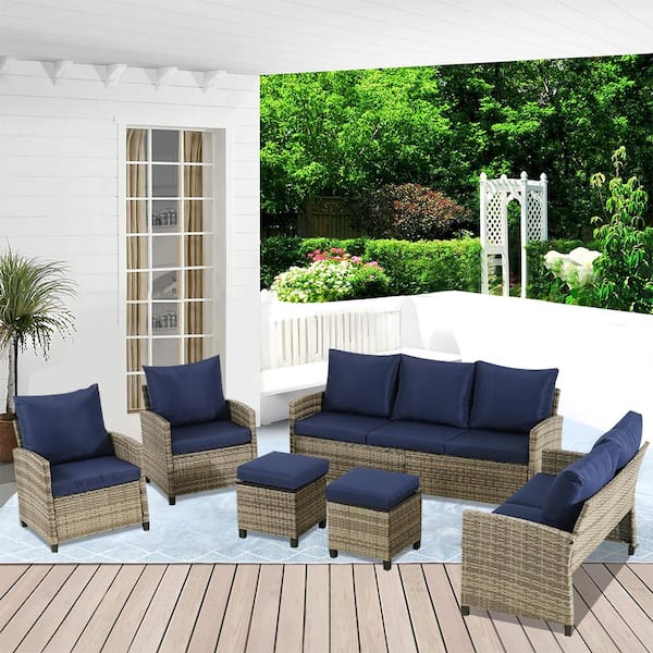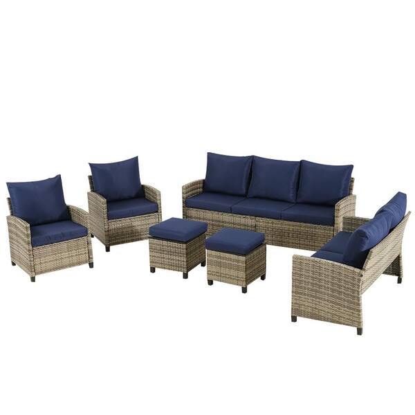 Gray 6-Piece Wicker Outdoor Sectional Set with Blue Cushions and Ottoman