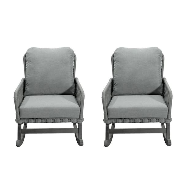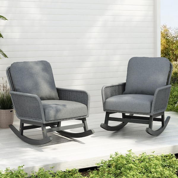 Gray Wood Outdoor Rocking Chair with Beige Cushions
