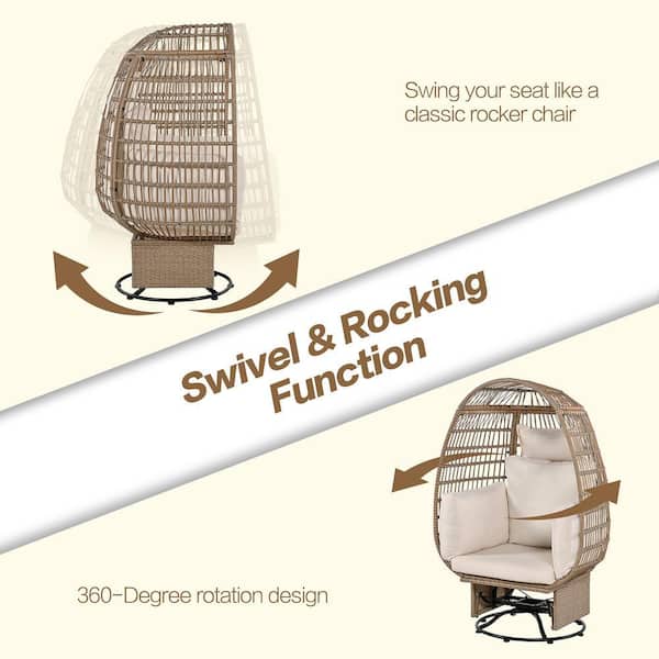 Natural Wicker Outdoor Rocking Chair Rattan Egg Chair with Beige Cushions and Rocking Function