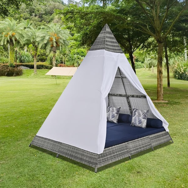 Tent Shape 90.5 in.W Grey Wicker Outdoor Day Bed with Navy Blue Cushions