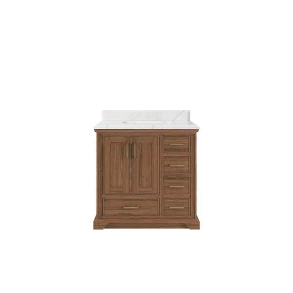 Charlotte Teak 36 in. W x 22 in. D x 36 in. H Center Sink Bath Vanity in Dark Natural with 1.5 in. Calacatta Laza Top