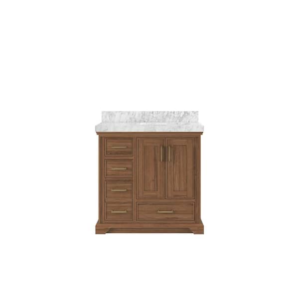 Charlotte Teak 36 in. W x 22 in. D x 36 in. H Right Offset Sink Bath Vanity in Dark Natural with 2" Carrara Marble Top