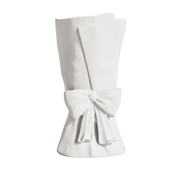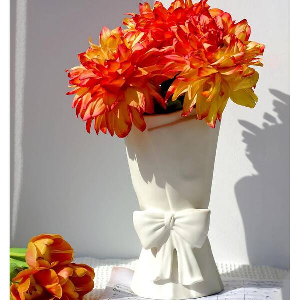Charming White Ceramic Bow Vase, 5.11" x 5.11" x 9.64" - Ideal for Decorative Bouquets Round