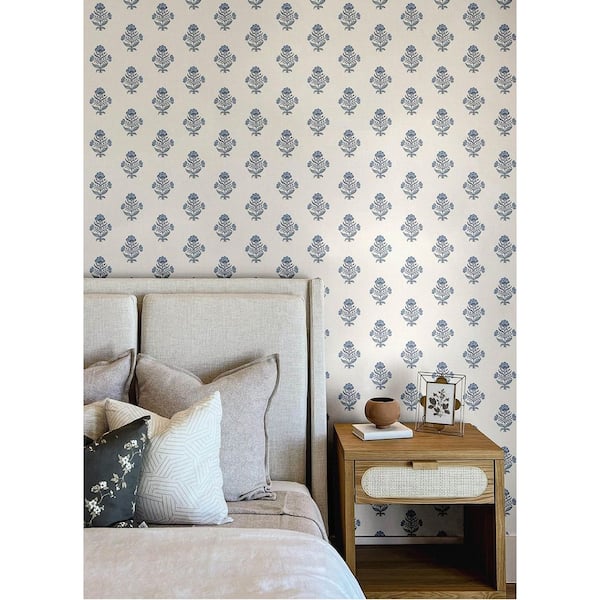 Hollyhock Blue Floral Crest Wallpaper Sample