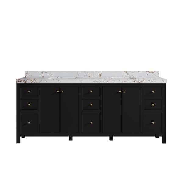 Chicago 84 in. W x 22 in. D x 36 in. H Double Sink Bath Vanity in Black with 2 in. Viola Gold Quartz Top