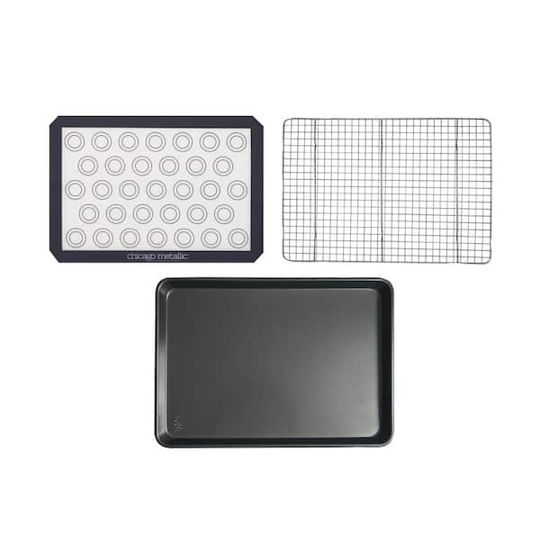 • 3-piece set includes a roll pan, a baking mat, and a baking rack