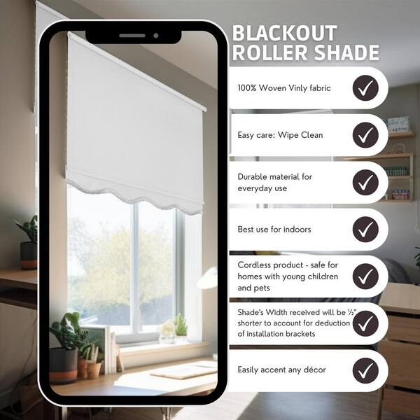 Fringe White Solid Cordless Blackout Privacy Vinyl Roller Shade 19.25 in. W x 64 in. L