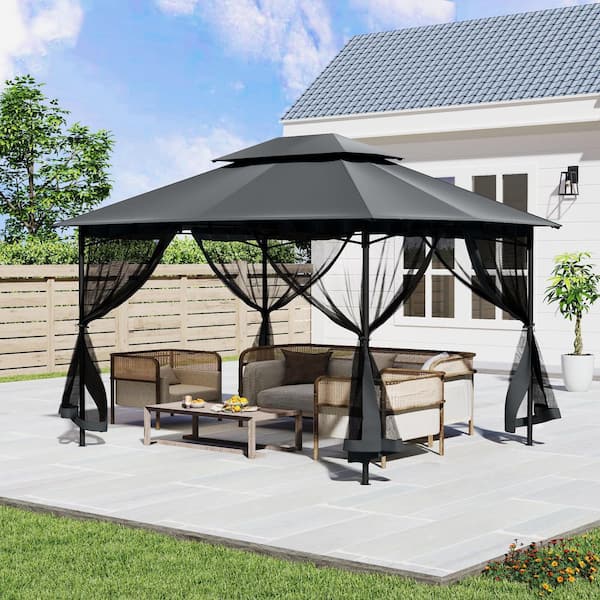 10 ft. x 12 ft. Gray Outdoor Metal Gazebo with Double Roof Soft Top and Netting