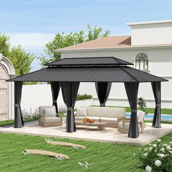 12 ft. x 20 ft. Gray Metal Double-Roof Hardtop Patio Gazebo with Integrated Netting and Adjustable Curtains