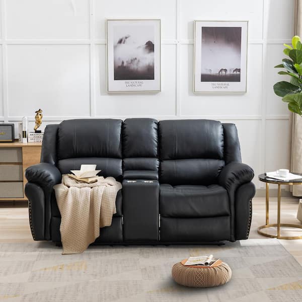 76.77 in. Wide Pillow Top Arm Vegan Leather Pillow Top Arm Recliner Loveseat Sofa in Black