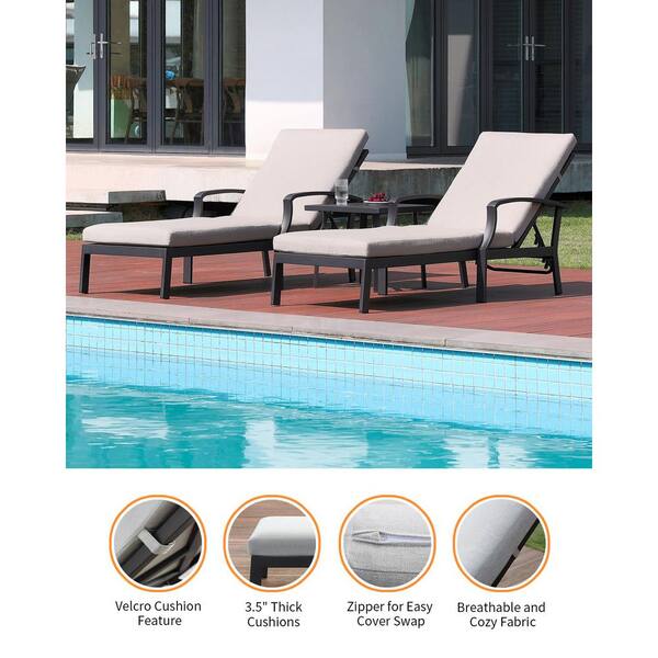 Black Aluminum 3-Piece Outdoor Patio Chaise Lounge Chair with Side Table and Cream Cushions