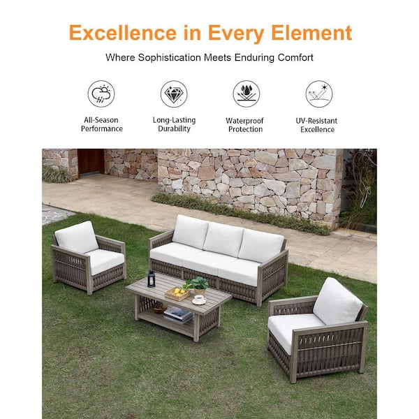 Brown 4-piece Woven Rope Alluminum Outdoor Patio Conversation Set with Rectangular Coffee Table and Cream Cushions