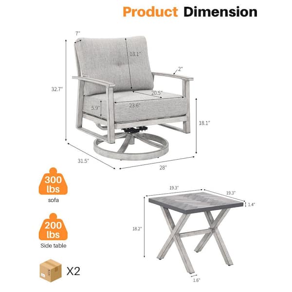 Grey Vintage 3-Piece Aluminum Outdoor Patio Conversation Swivel Sofa Set with Resin Top Sidetable and Grey Cushions