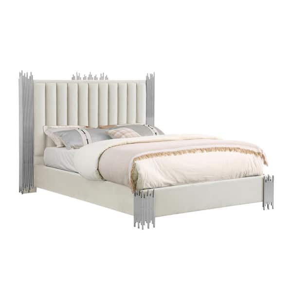 Clarisse Beige/Cream Velvet Fabric Upholstered Wood Frame Queen Platform Bed With Stainless Steel Legs