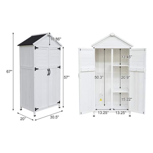 • Spacious white storage shed for garden tools and equipment