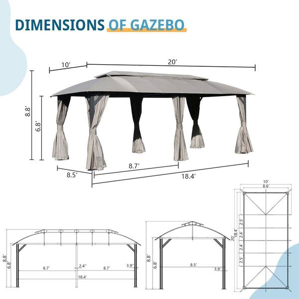 10 ft. x 20 ft. Outdoor Gazebo Heavy Duty Metal Frame Party Tent Canopy with Double Roofs, Curtains, Nettings, Grey