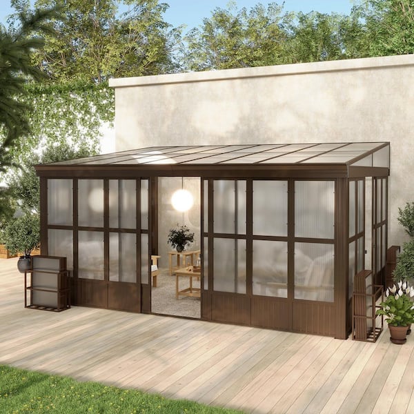 12 ft. x 16 ft. Lean-To Aluminum Gazebo Sunroom with Sloping Roof, Detachable Screens and 2-Lockable Sliding Door