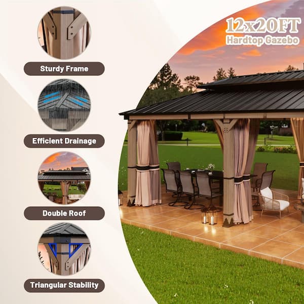 12 ft. x 20 ft. Fir Wood Gazebo with Galvanized Steel Hardtop Double Roof, Insect Screens and Privacy Curtains