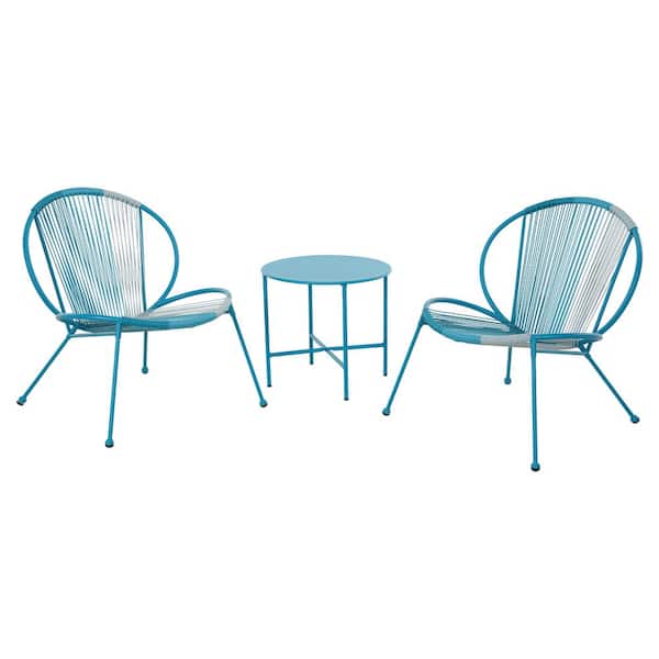3-Piece Metal Patio Acapulco Chairs Outdoor Conversation Set Plastic Rope Lounge Chair with Side Table, Blue