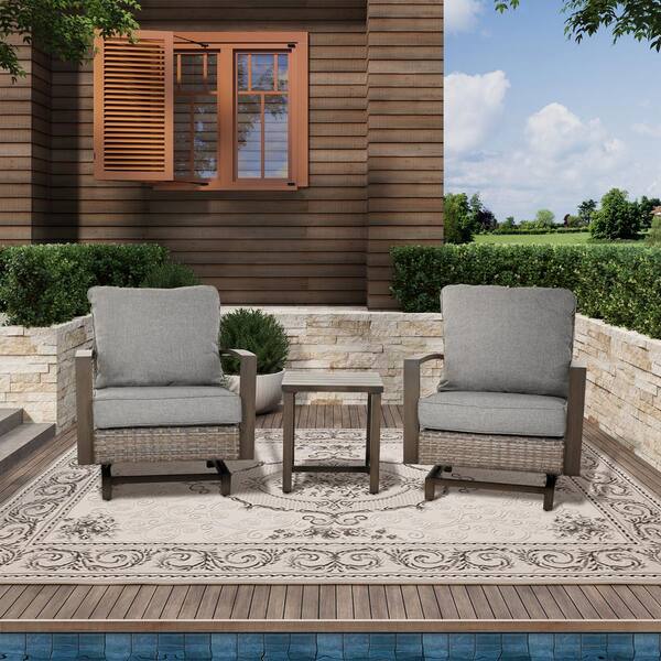 3-Piece Patio Conversation Bistro Set with 2 x PE Wicker Rocker Chair, Side Coffee Table and Gray Cushion