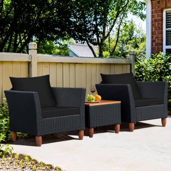 3-Piece Wicker Outdoor Patio Conversation Set Furniture Set with Black Cushions and Acacia Wood Coffee Table