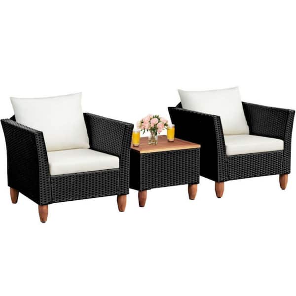 3-Piece Wicker Outdoor Patio Conversation Set Furniture Set with White Cushions and Acacia Wood Coffee Table