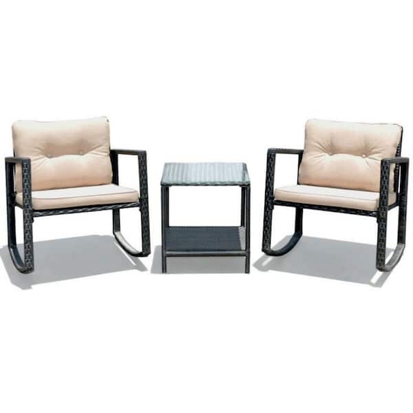 3-Piece Wicker Patio Conversation Set with Beige Cushions, Rocking Chair and Glass Coffee Table