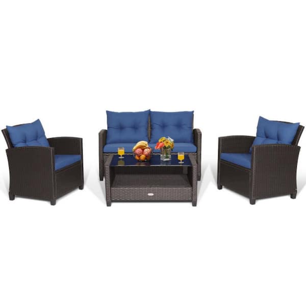4-Piece Wicker Outdoor Patio Conversation Set Rattan Furniture Set with Navy Cushions and Tempered Glass Coffee Table