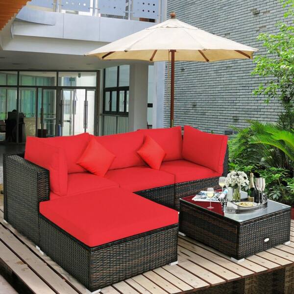 5-Piece Wicker Outdoor Patio Conversation Set Rattan Sectional Furniture Set with Red Cushions