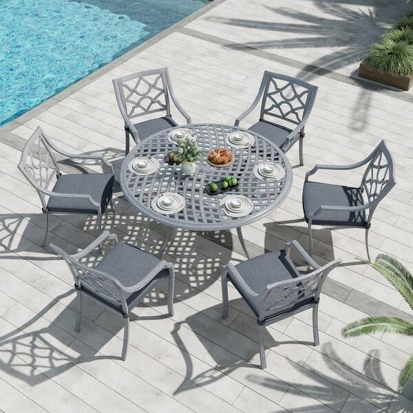 6 Pack Grey Seat Cushion Cast Aluminum Dining Chairs Outdoor Patio Furniture Set for Garden Poolside Backyard