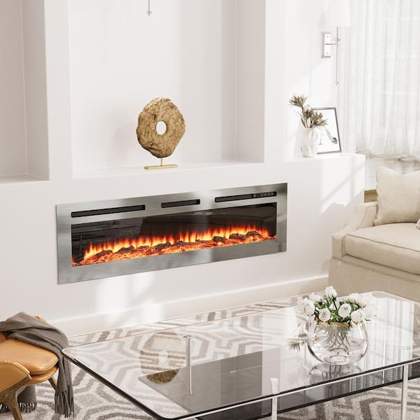 60 in. Wall Mounted and Recessed Electric Fireplace Insert with Stainless Steel Surface and 12 Flame Colors