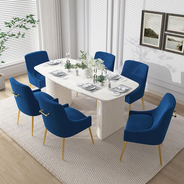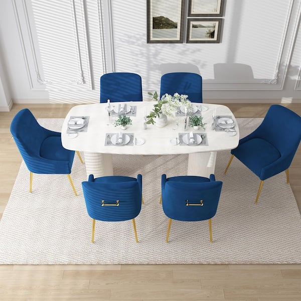 7-Piece Solid Wood Top Dining Table Set with Navy Blue Velvet Dining Chair (Seats of 6)