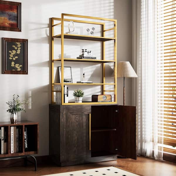 79 in. Tall Metal Golden 3-Shelves Bookcase Freestanding Bookshelf with 2-Doors Storage Cabinet