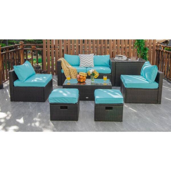 8-Piece Wicker Patio Conversation Space-Saving Set with Turquoise Cushions, Storage Box and Waterproof Cover