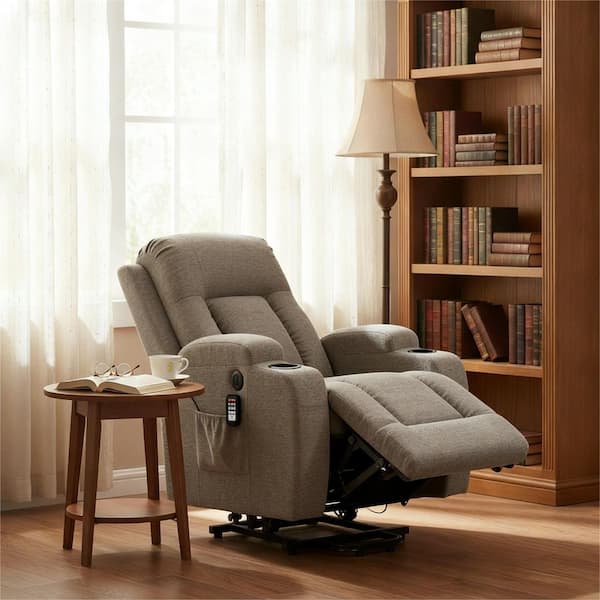 Brown Single Motor Power Lift Recliner Chair Polyester Massage Chair with USB Charging Port, Cup Holders
