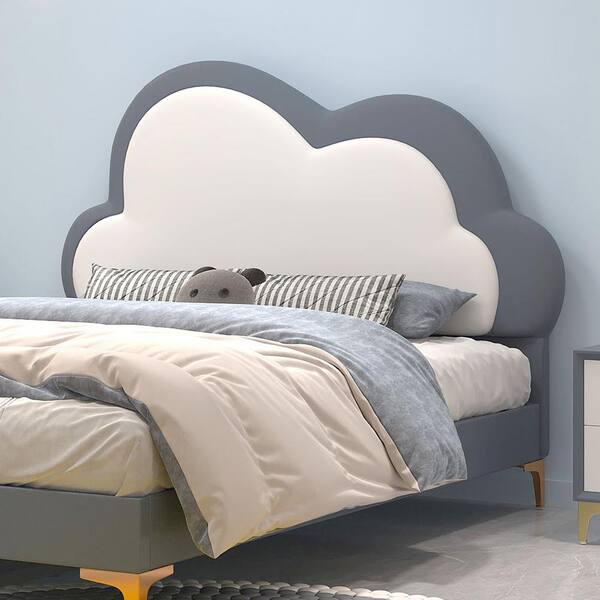 Gray Queen Size Soft Padded Kid's Bed with Elegant Floral Headboard, Large Platform Bed Frame, and Wooden Support