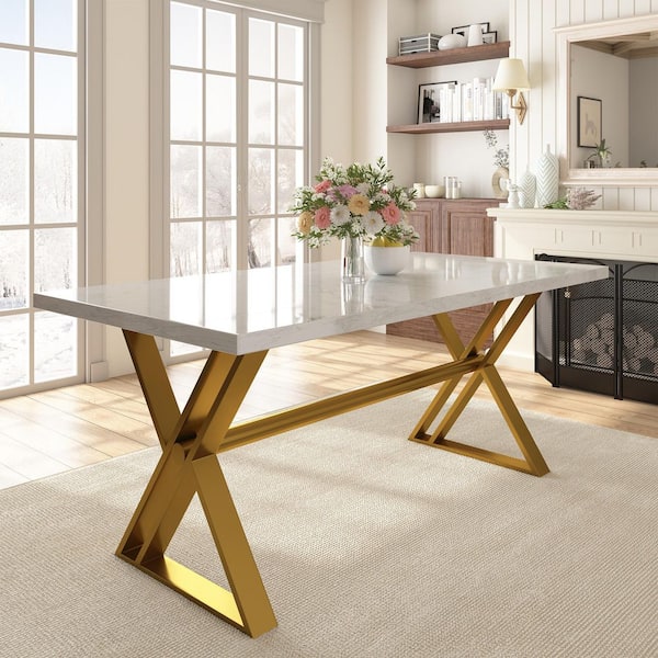 Natural Marble Top 71 in. Pedestal Dining Table with X-Shape Stainless Steel (Seat of 6 to 8)