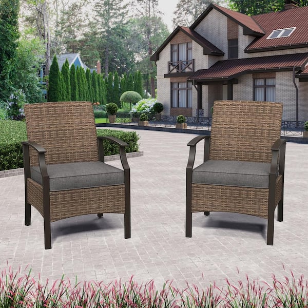 Rattan Outdoor Dining Chairs Patio Wicker Chairs with Gray Cushion and Metal Armrest and Leg (2-Pack)