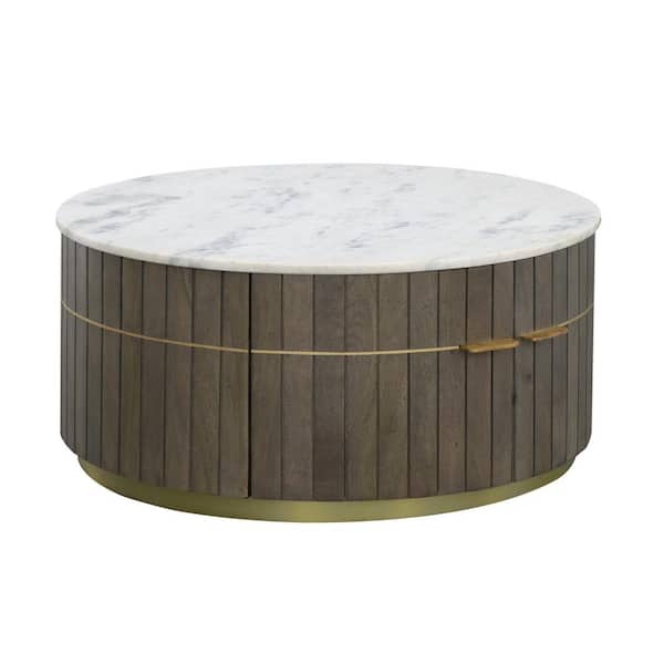 34 in. Nolan Grey and White Marble Round Marble Top Material Coffee Table with 4-Doors