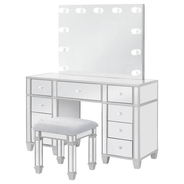 Allora 3-Piece Metallic and Gray 9-Drawers Mirrored Storage Makeup Vanity Set with Hollywood Lighting