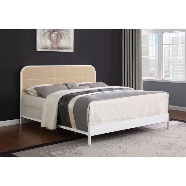 Amherst White Metal Frame Eastern King Panel Bed with Radio Weave Rattan Headboard