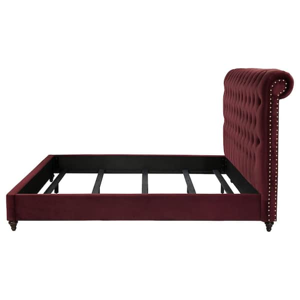 Devon Wine Red Wood Frame Upholstered Eastern King Panel Bed with Tufted Rolled High Headboard
