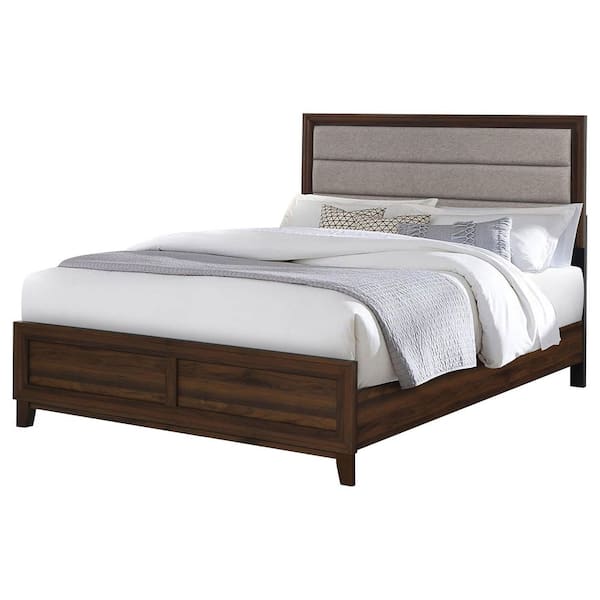 Welsley Walnut Brown and Taupe Wood Frame Eastern King Panel Bed with Padded Headboard