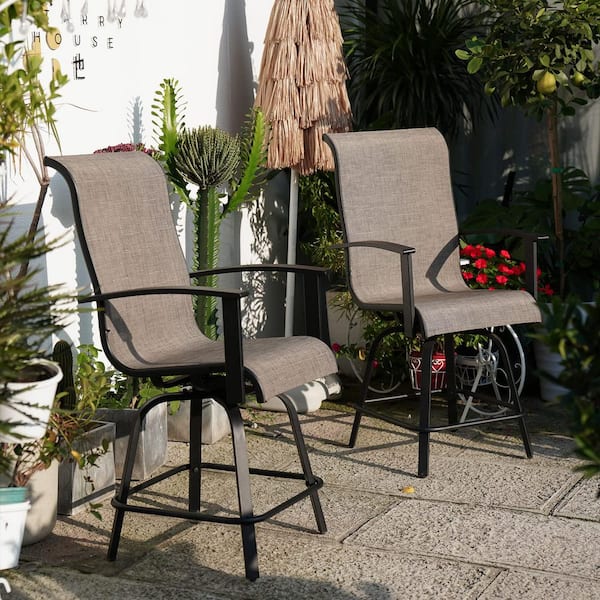Coffee Swivel Metal Outdoor Bar Stool with Arms Backs for Porch Balcony, Poolside, Deck (2-Pack)