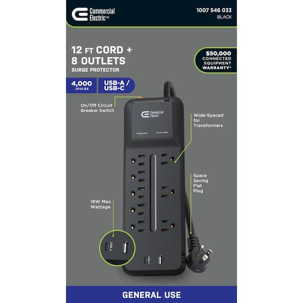 12 ft. Braided Cord 8-Outlet Surge Protector with 1 USB and 1 USB-C, Black