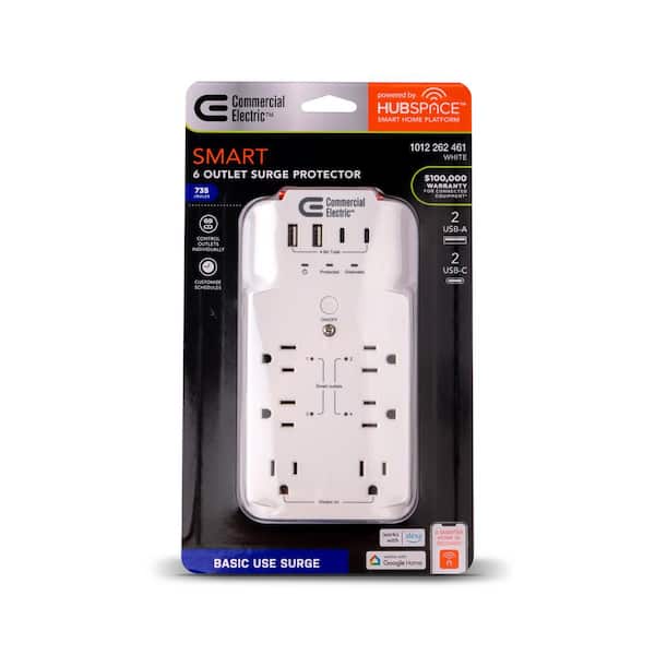 6-Outlet Smart Surge Protector with 4-USB Ports, White, Powered by Hubspace