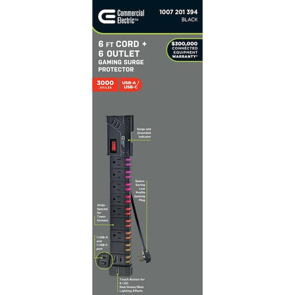 6 ft. 6-Outlet RGB Gaming Surge Protector with 1 USB-A and 1 USB-C, Black